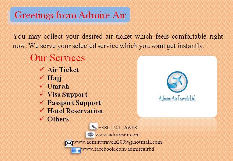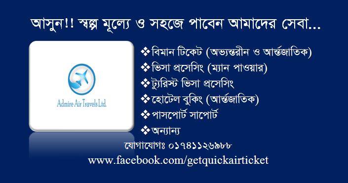 Admire Air Travels Ltd. is a travel agency that is located in Tejgao,Dhaka. It's a reputable travel company. Admire Air Travels Ltd. makes it simple for you to travel to any place without experiencing any inconvenience.So, if you're seeking for a travel agency, you may just trust the Admire Air Travels Ltd.