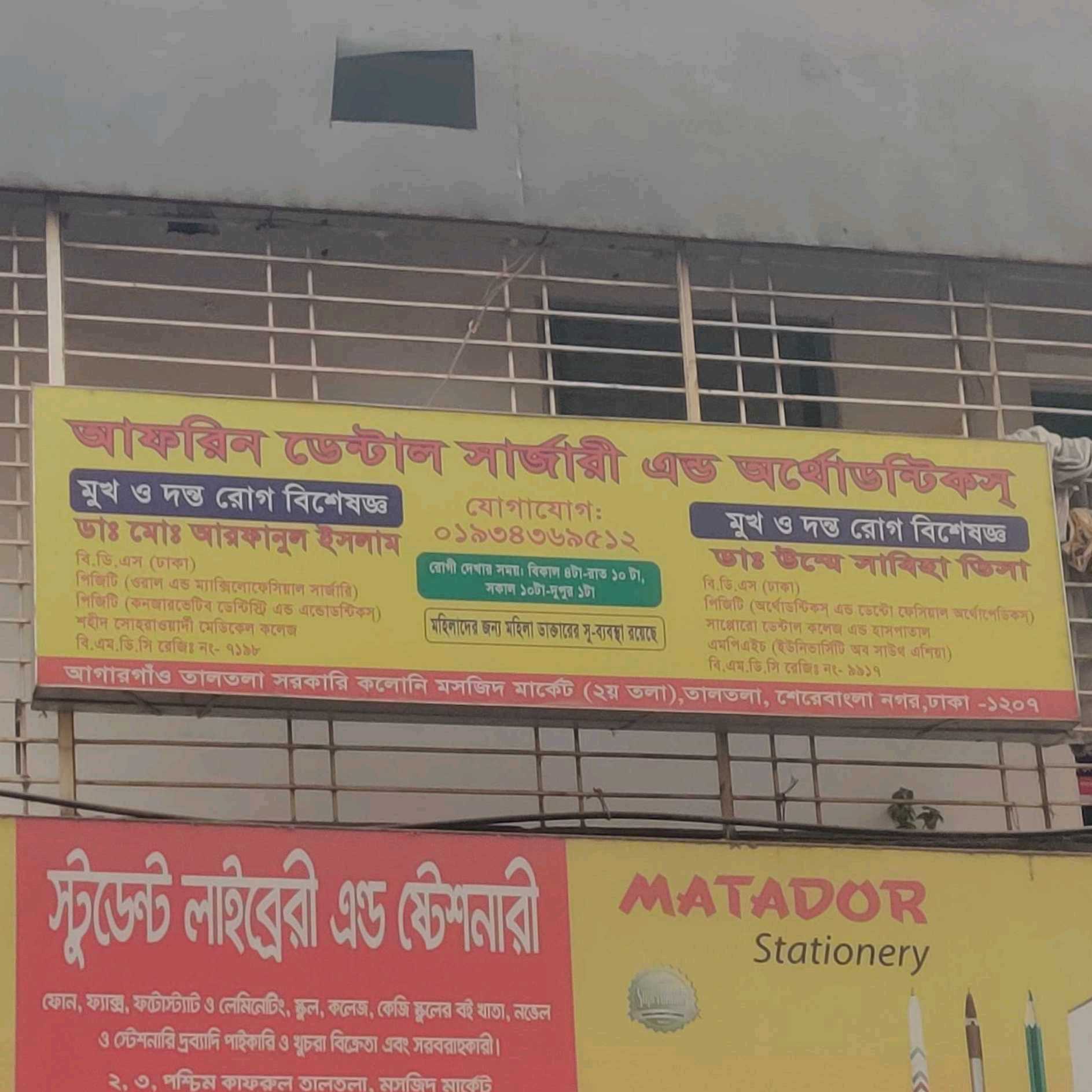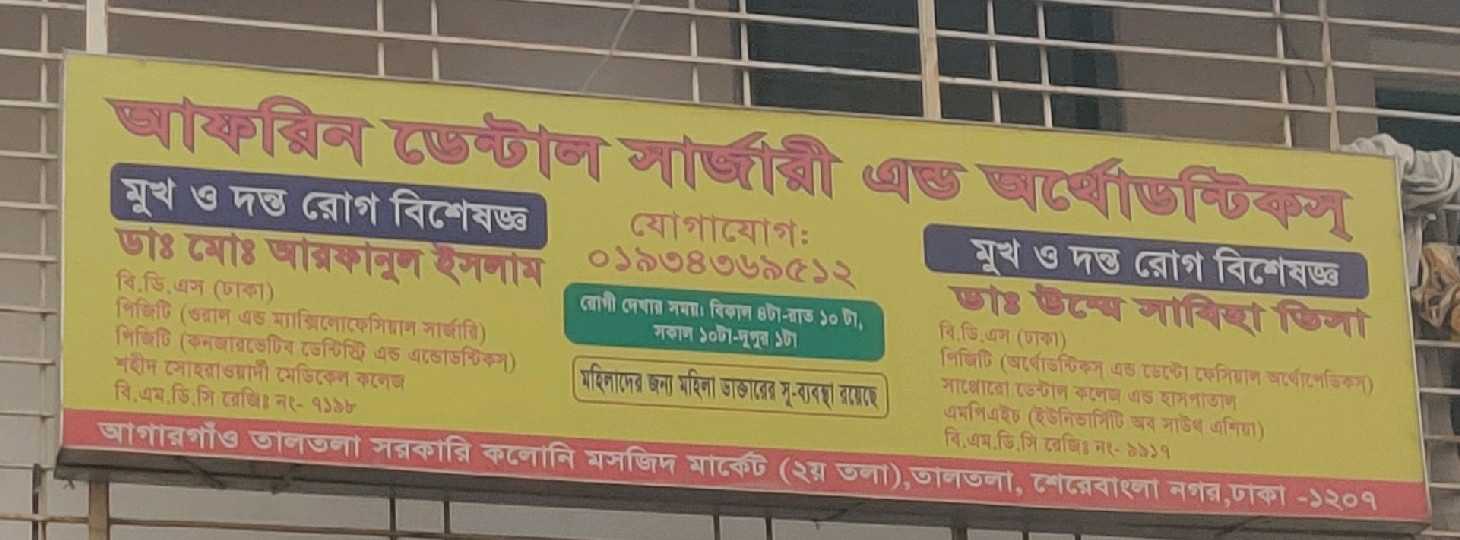 Afrin Dental Surgery and Orthodontics, located in Agargaon Taltola, Dhaka, provides specialised oral and dental care for patients of all ages. The clinic is led by Dr. Md. Arfanul Islam (BDS, DU; PGT in Oral & Maxillofacial Surgery, PGT in Conservative Dentistry & Endodontics, Shahid Suhrawardy Medical College, BMDC Reg. No. 7198) and Dr. Umme Sabiha Visa (BDS, DU; PGT in Orthodontics & Dentofacial Orthopedics, Sapporo Dental College, MPH, University of South Asia, BMDC Reg. No. 1917), offering expert treatment in general dentistry, orthodontics, endodontics, and cosmetic procedures.