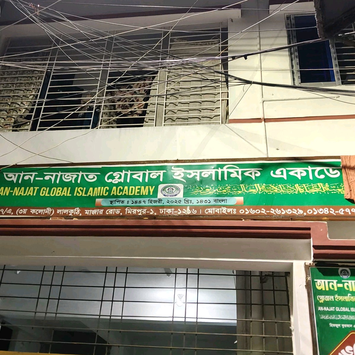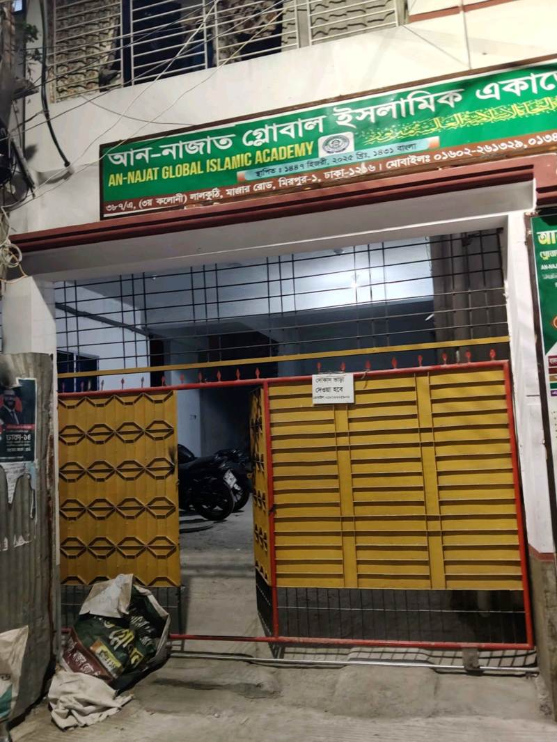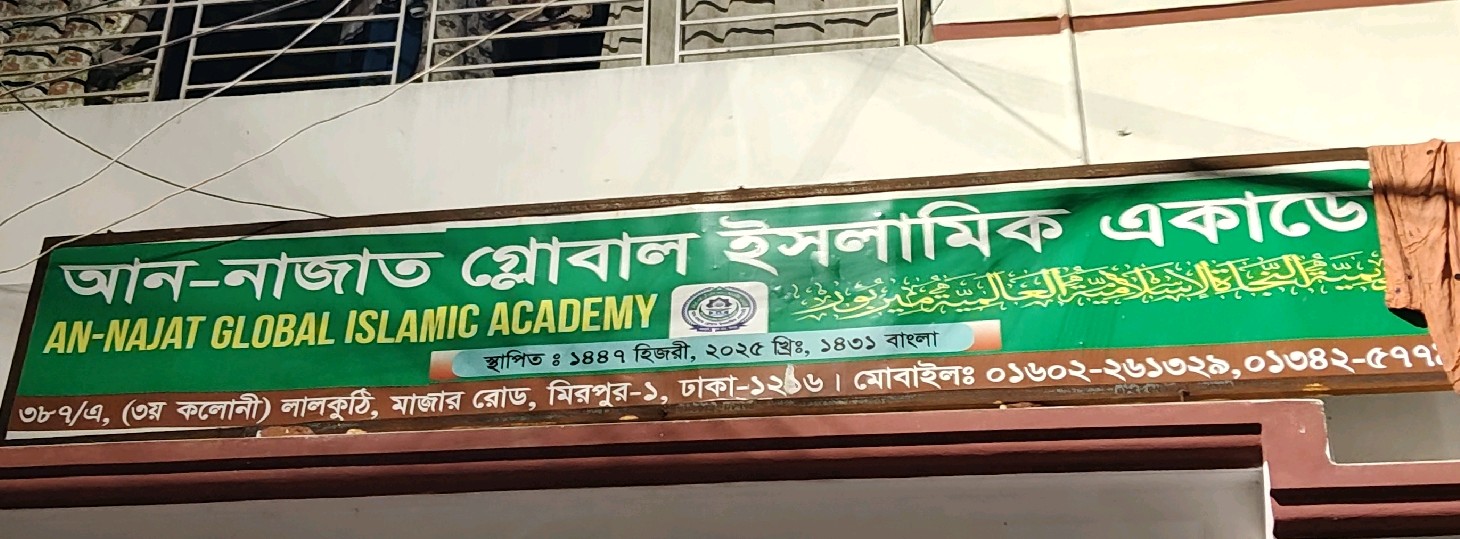 An-Najat Global Islamic Academy is a newly established Islamic educational institution located in Mirpur-1, Dhaka, dedicated to providing structured religious and academic learning. Founded in 1447 Hijri (2025 Gregorian), the academy focuses on developing strong Islamic knowledge alongside moral and ethical values for students. It offers a disciplined learning environment aimed at nurturing future generations with proper Islamic guidance and contemporary education support. Situated at 3787/A, 3rd Colony, Lal Kuthi, Mazar Road, the institution is easily accessible for local families. With a commitment to quality teaching and student development, it plays an important role in strengthening Islamic education in the area.