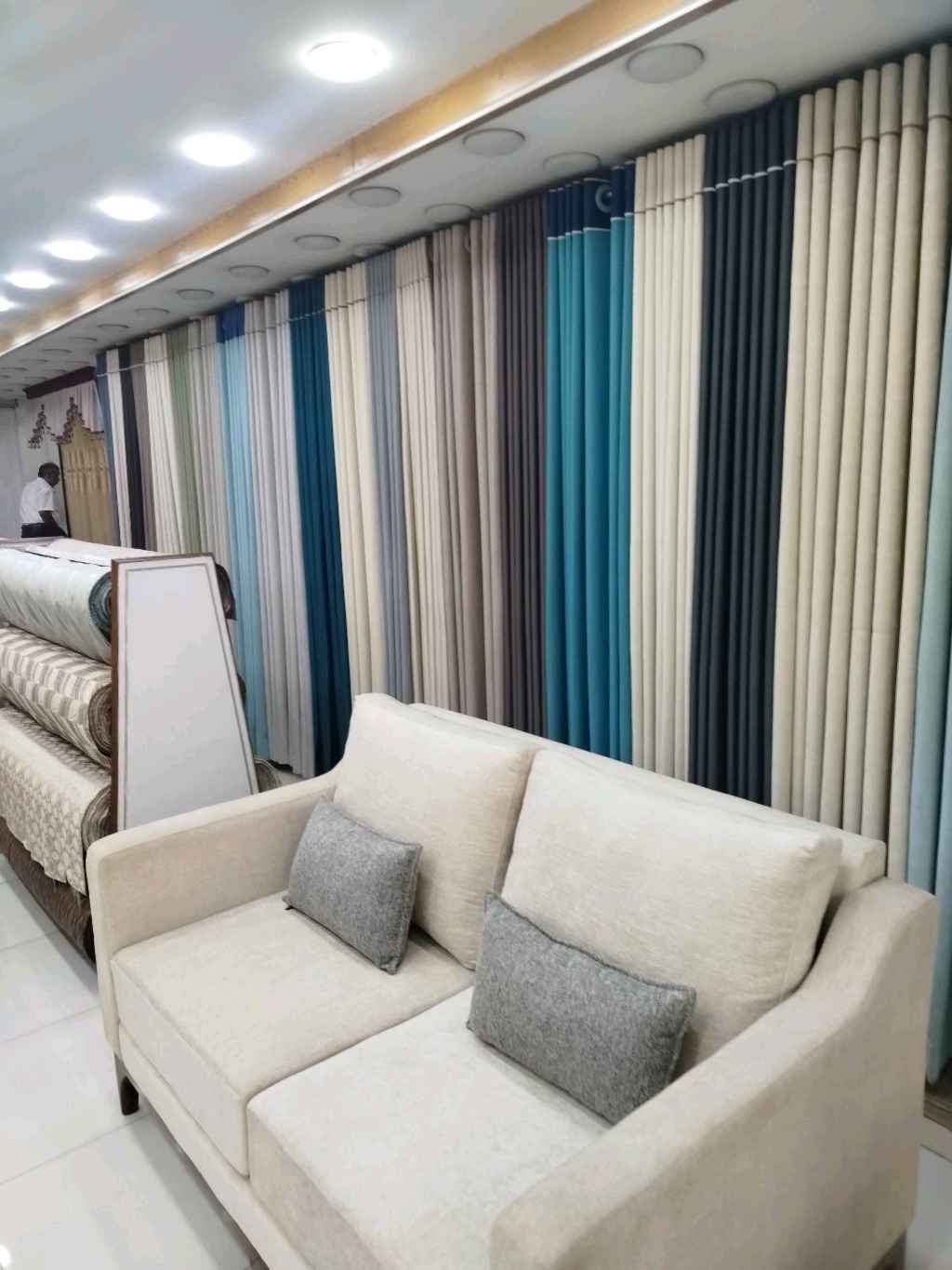 All types of curtains and sofa's are available here