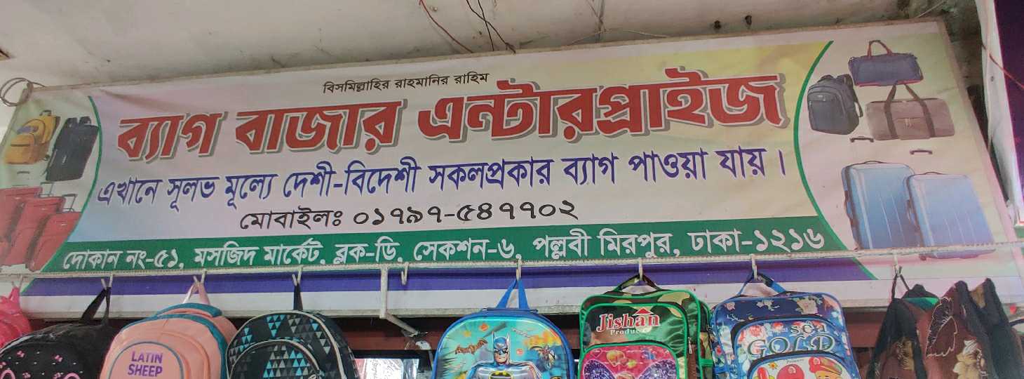Bag Bazar Enterprise, operating under Bismillahir Rahmanir Rahim, is a trusted shop offering a wide range of domestic and imported bags at affordable prices. The store provides stylish and practical bags suitable for daily use, travel, office, and special occasions. Customers can explore a variety of designs, colours, and sizes to meet personal preferences and lifestyle needs. With a focus on quality, affordability, and customer satisfaction, Bag Bazar Enterprise has become a reliable destination for shoppers seeking durable and trendy bags in the local area. The shop ensures a convenient shopping experience with attentive service and diverse options.