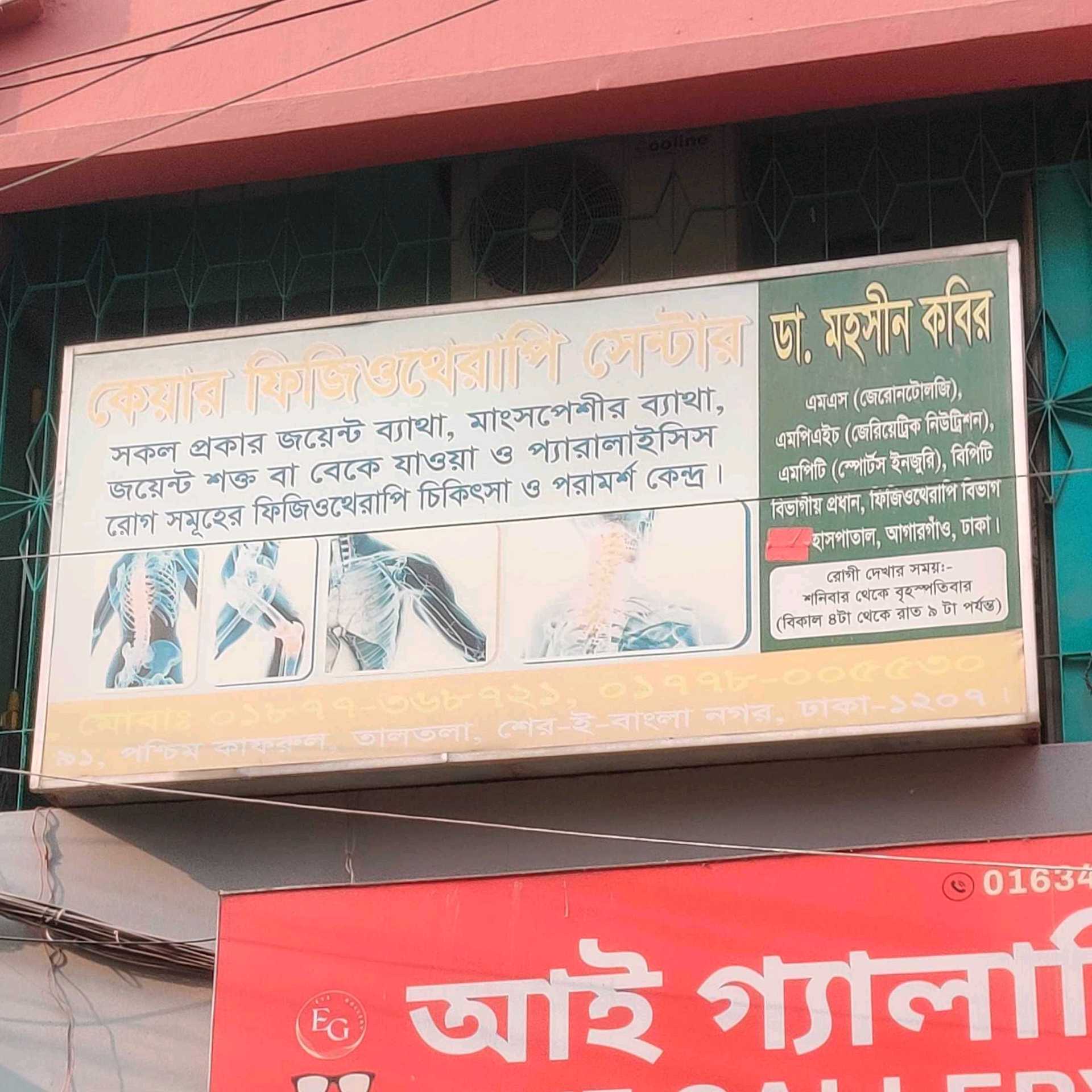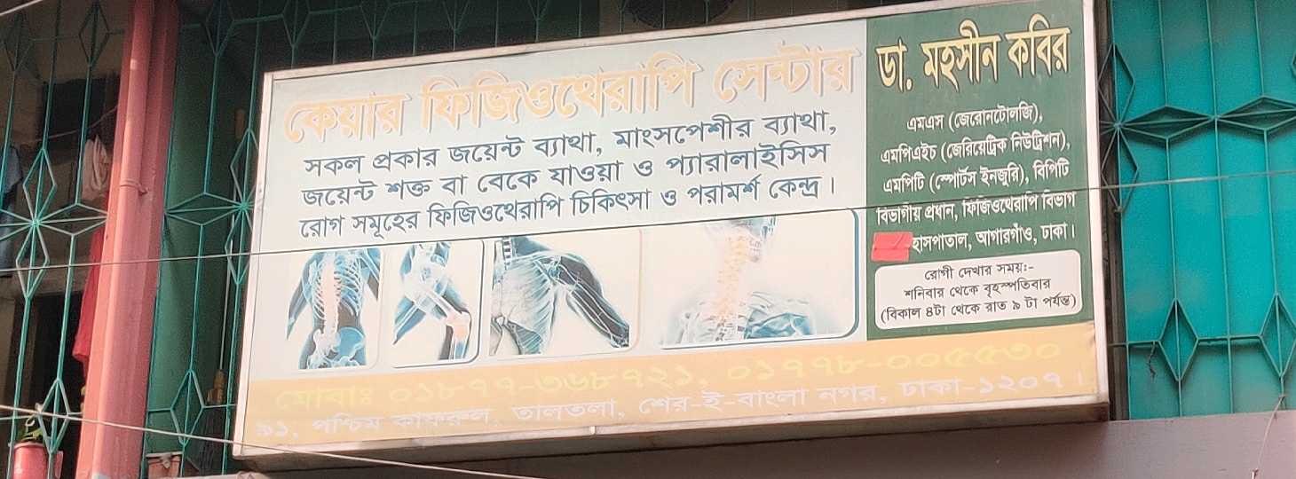 Care Physiotherapy Poster, located in Agargaon, Dhaka, is a dedicated centre for physiotherapy treatment and consultation. The clinic specialises in managing joint pain, muscle soreness, stiffness, mobility issues, and paralysis-related conditions. Led by Dr. Mohsin Kabir, MS (Gerontology), MPH (Geriatric Nutrition), MPT (Sports Injury), and Head of the Physiotherapy Department at a Dhaka hospital, the centre provides professional and evidence-based therapies to improve mobility, reduce pain, and support overall physical rehabilitation. Patients benefit from personalised treatment plans, expert guidance, and a structured therapy environment aimed at promoting faster recovery and long-term wellness.