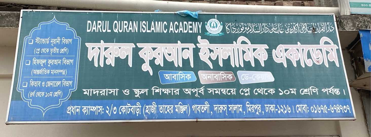 Darul Quran Islamic Academy is a modern Islamic educational institution offering a balanced combination of religious and general education from Play Group to Class X. The academy provides structured learning through Standard Noorani, Hifz-ul-Quran, and Kitab & General sections, ensuring both spiritual development and academic excellence. With residential, non-residential, and day-care facilities, it supports students in a disciplined and caring environment. Located in Gabtoli, Mirpur, Dhaka, the institution is committed to quality education, moral values, and proper Quranic training under experienced teachers.