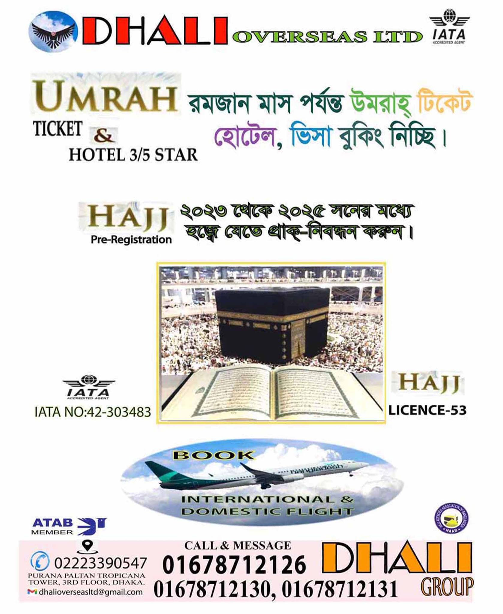 Dhali Overseas Ltd, founded in the 1990s, is a renowned travel agency specializing in HAJJ and Umrah pilgrimage services, as well as ticketing and visa processing. With decades of experience in the industry, Dhali Overseas has established itself as a trusted name, providing exceptional services to individuals and families embarking on their sacred journeys.