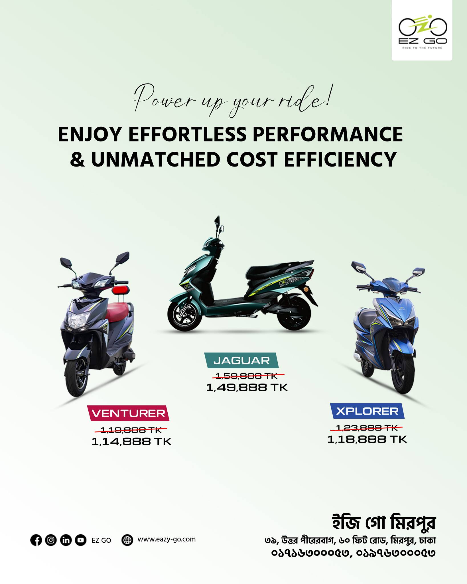 Ez Go is a trusted electric vehicle (EV) dealership in Mirpur, Dhaka, dedicated to promoting eco-friendly and affordable transportation. We specialize in a wide range of high-performance electric scooters, bikes, and cars designed for Bangladesh’s roads. With our reliable after-sales service and genuine spare parts, Ez Go ensures that every customer enjoys a smooth and sustainable driving experience.