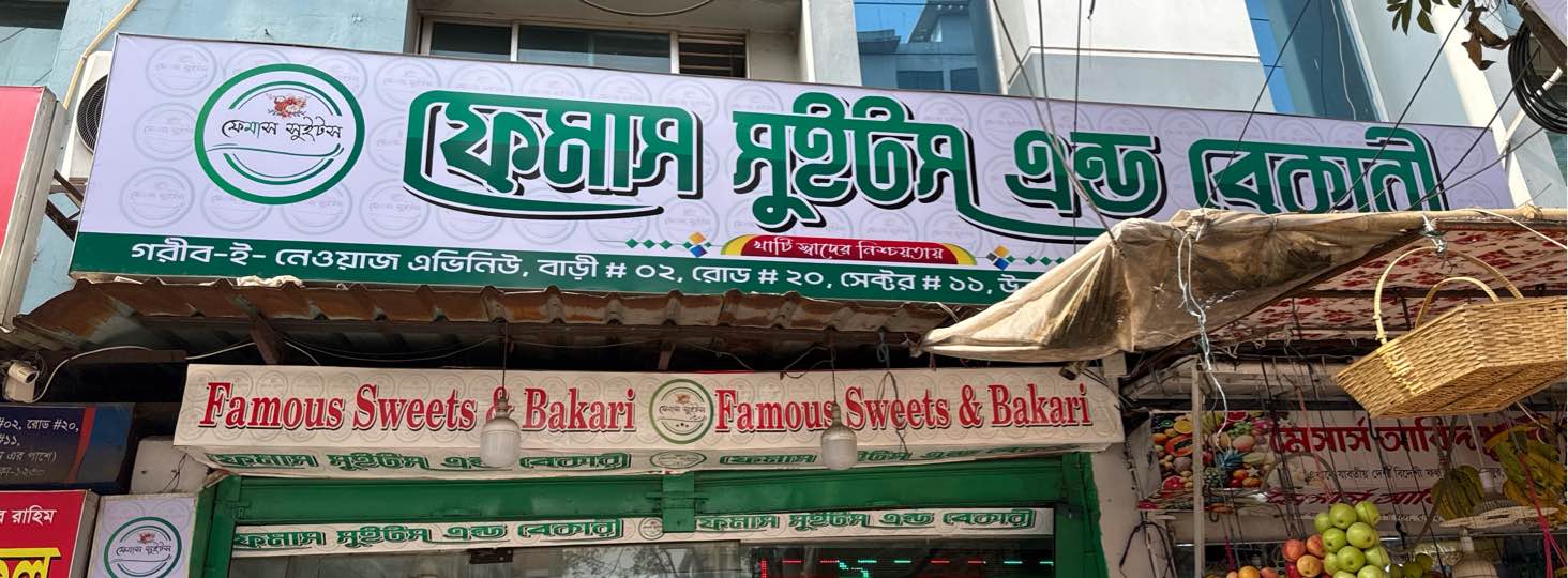 Famous Sweets, located in Sector 11, Uttara, is a trusted confectionery shop offering a rich variety of traditional and bakery-based treats. Known for its authentic taste and consistent quality, the shop serves local sweets prepared using time-honoured recipes, along with fresh yogurt, cookies, and a selection of bakery items. Whether you are buying sweets for celebrations, daily desserts, or light snacks, Famous Sweets provides reliable freshness and flavour in every item. Its welcoming service and convenient location make it a popular choice among local residents seeking quality sweets and baked goods.