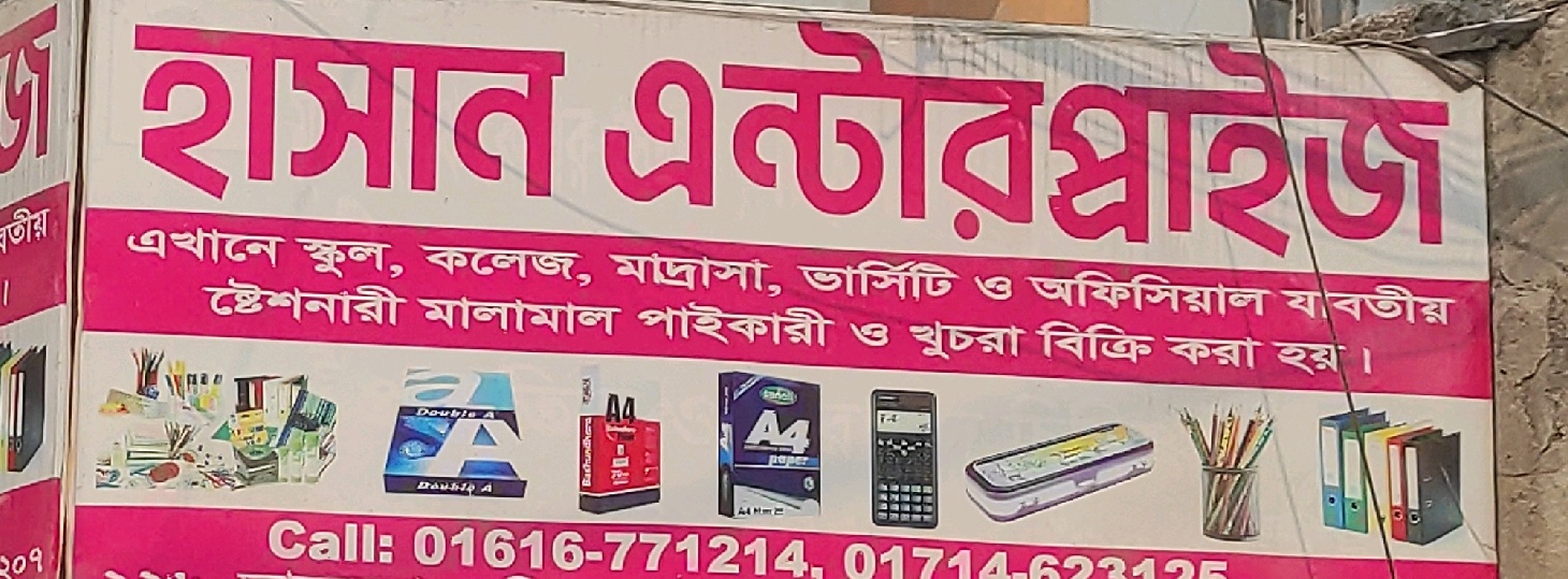 Hasan Enterprise is a reliable stationery supplier located in Dhaka, providing a comprehensive range of products for schools, colleges, madrasas, universities, and offices. The store offers both wholesale and retail sales, ensuring accessibility for individual students as well as institutional buyers. Customers can find essential stationery items such as notebooks, pens, pencils, markers, files, registers, exam materials, and office documentation supplies. The shop also stocks educational tools and office essentials required for daily academic and administrative activities. Known for fair pricing, organised inventory, and attentive customer service, Hasan Enterprise serves as a dependable source for quality stationery and institutional supply needs.