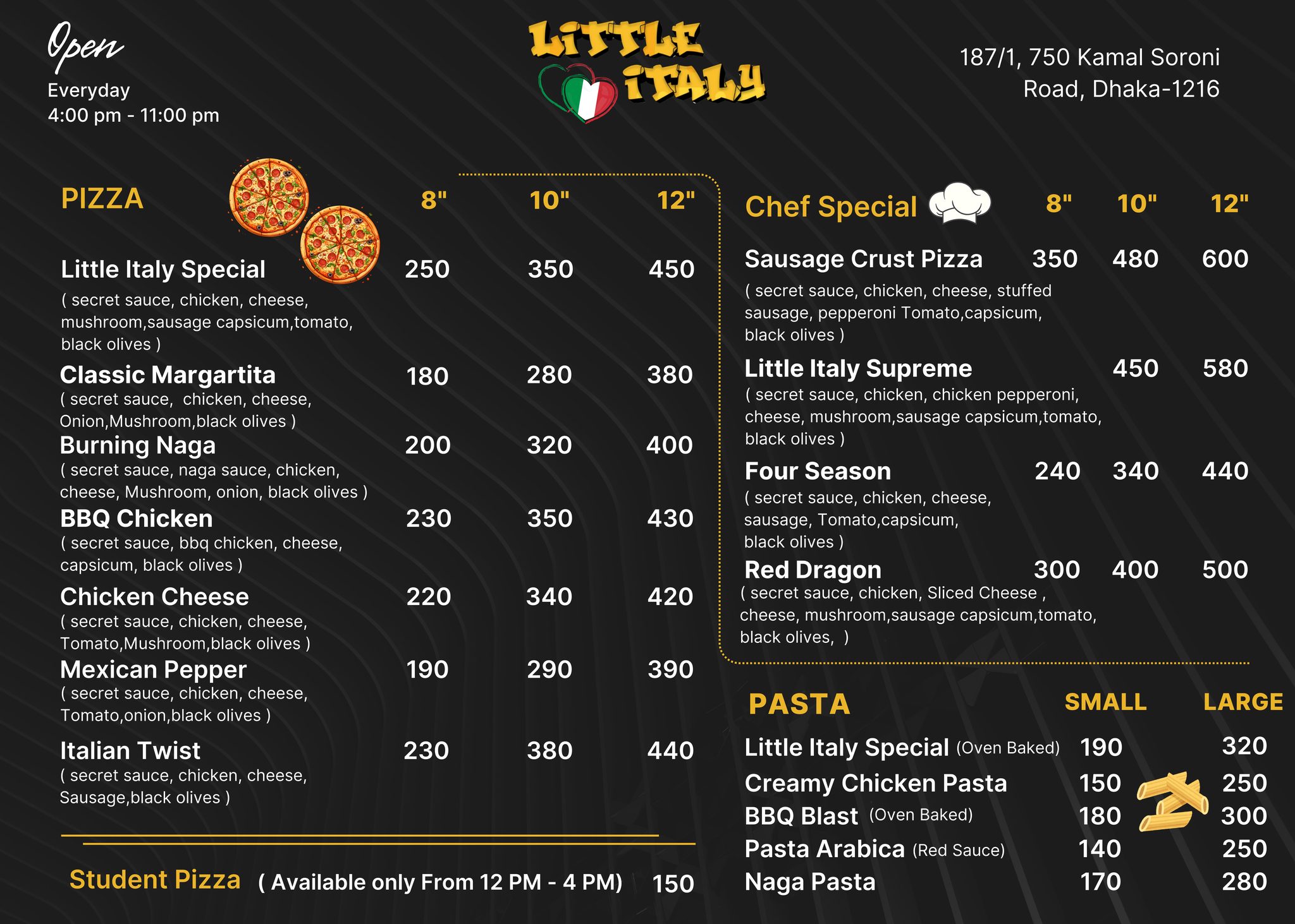 Looking for a cozy spot to indulge in authentic Italian flavors in Mirpur? Little Italy Co Cafe offers a delightful escape with its delicious Italian cuisine, warm ambiance, and exceptional service. Savor classic pasta, wood-fired pizzas, creamy risottos, and delectable desserts, all crafted with fresh ingredients and a touch of Italian love. Conveniently located in the heart of Mirpur, this cafe is perfect for casual hangouts, family meals, or romantic dinners. Experience a taste of Italy without leaving Dhaka!