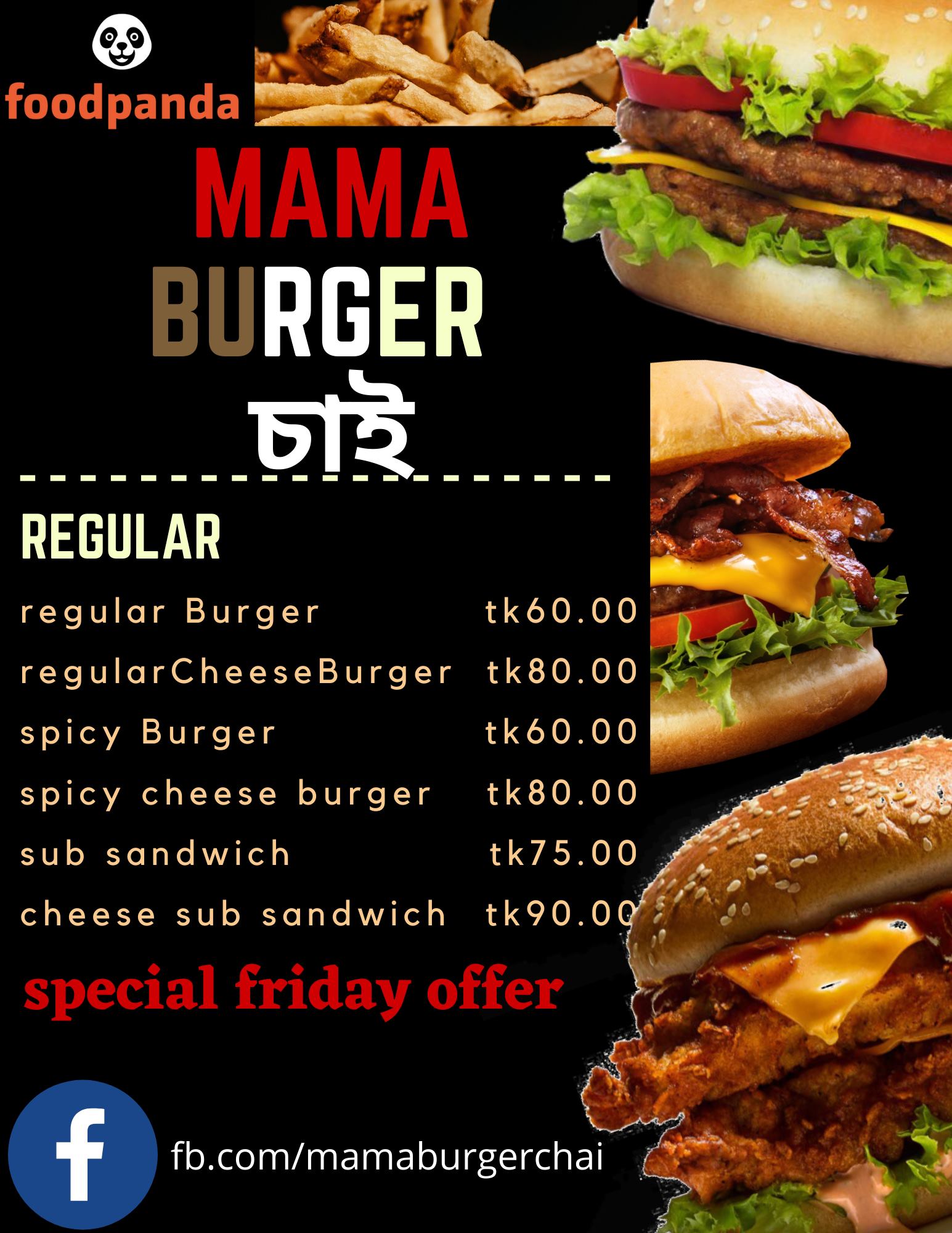 Located in the heart of Mirpur, Mama Burger Chai is your go-to spot for delicious burgers, crispy snacks, and a perfect cup of chai. Whether you're craving a juicy chicken burger, spicy fries, or a relaxing tea break, we’ve got you covered with fresh flavors and fast service.