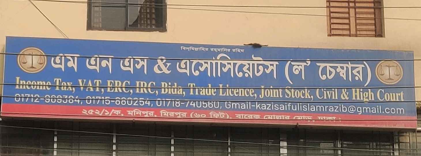 M N S & Associates, located at L’ Chamber in Dhaka, is a trusted firm providing professional services in income tax, VAT, ERC, IRC, and other regulatory compliances. The firm also assists clients with trade licences, joint stock company registration, and legal matters in civil and high courts. With experienced professionals, M N S & Associates offers accurate guidance and ensures timely compliance for individuals, businesses, and organisations. Their services are valued for reliability, efficiency, and thorough knowledge of local laws and regulations. Clients benefit from a one-stop solution for tax, legal, and corporate needs under expert supervision.