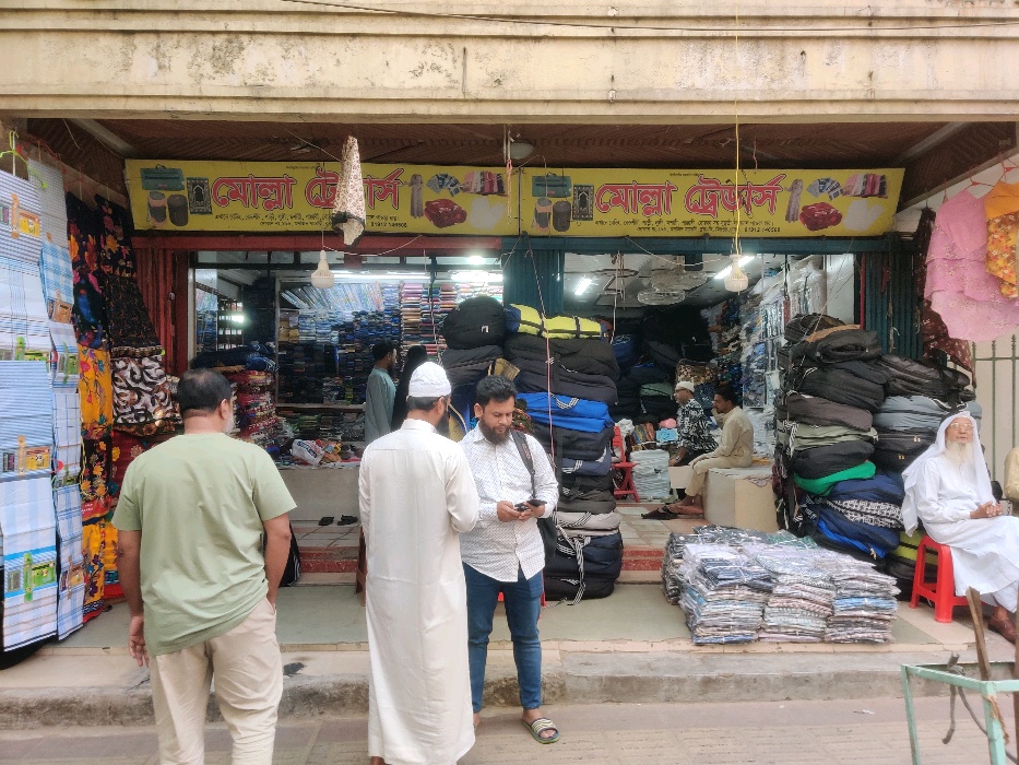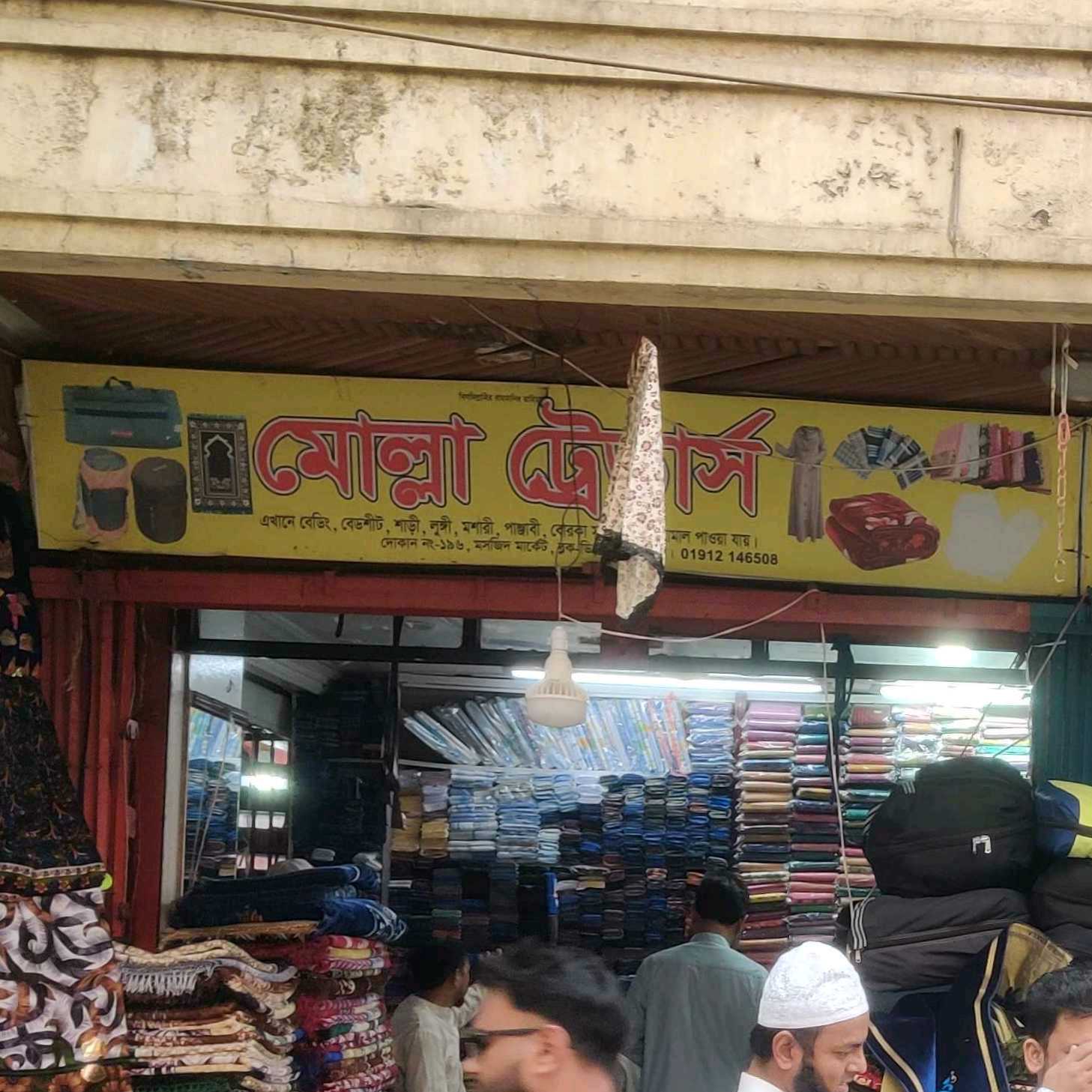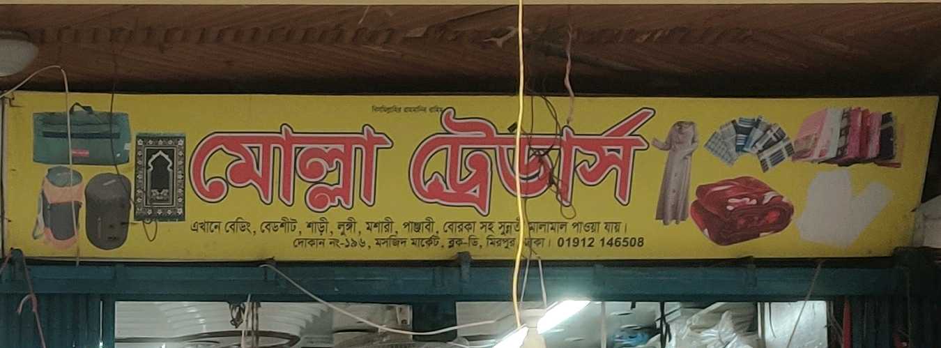 Molla Traders is a well-known retail shop located at Shop No. 196, Masjid Market, Block-D, Mirpur, Dhaka, offering a wide range of bedding items, clothing, and Sunnati products. The store provides essential household textiles such as bedding and bedsheets along with traditional garments including sarees, lungis, Punjabi outfits, and burqas. Customers can also find mosquito nets and various Sunnati items commonly used in daily life and religious practices. Molla Traders focuses on offering practical products at reasonable prices while maintaining dependable service for local shoppers. With its convenient location in Masjid Market, the shop continues to serve the community with useful clothing and household essentials.