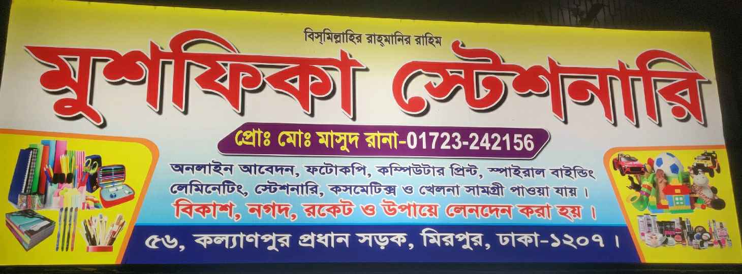Rahmanir Rahim Mushfika Stationery is a well-equipped service centre located at 56, Kallyanpur Main Road, Mirpur, Dhaka-1207. Managed by Md. Masud Rana, the shop provides a wide range of stationery products along with essential online and document services for students, job seekers, and local residents.
