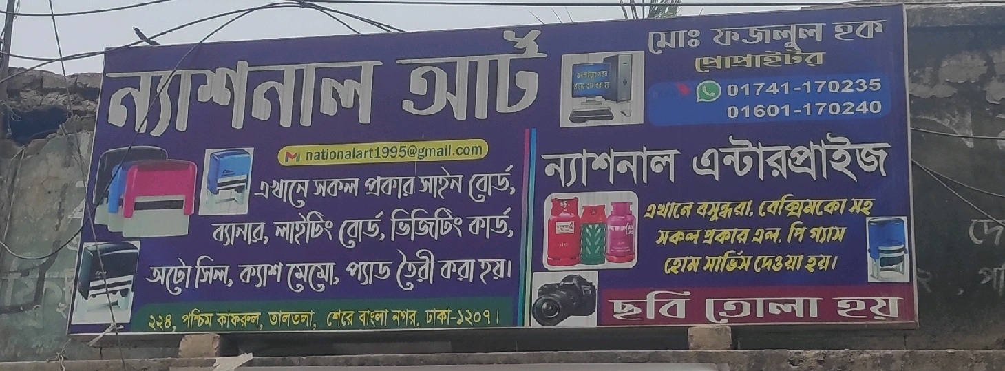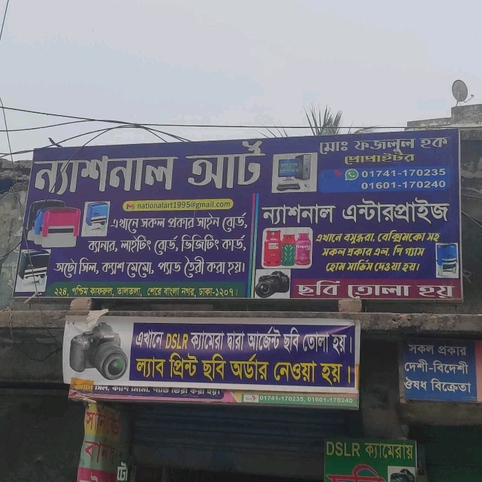 National Eight, located in Dhaka, is a versatile service provider offering customised printing, signage, and home services. The shop specialises in creating all types of signboards, banners, lighting boards, visiting cards, auto seals, cash memos, and notepads tailored to client requirements. In addition to printing solutions, National Eight provides home delivery and servicing for LP gas cylinders, including brands like Bashundhara and Beximco, ensuring safe and convenient gas supply for households. Known for quality workmanship, timely service, and customer-focused solutions, the business serves both commercial and residential clients seeking reliable printing and home utility services in the local community.