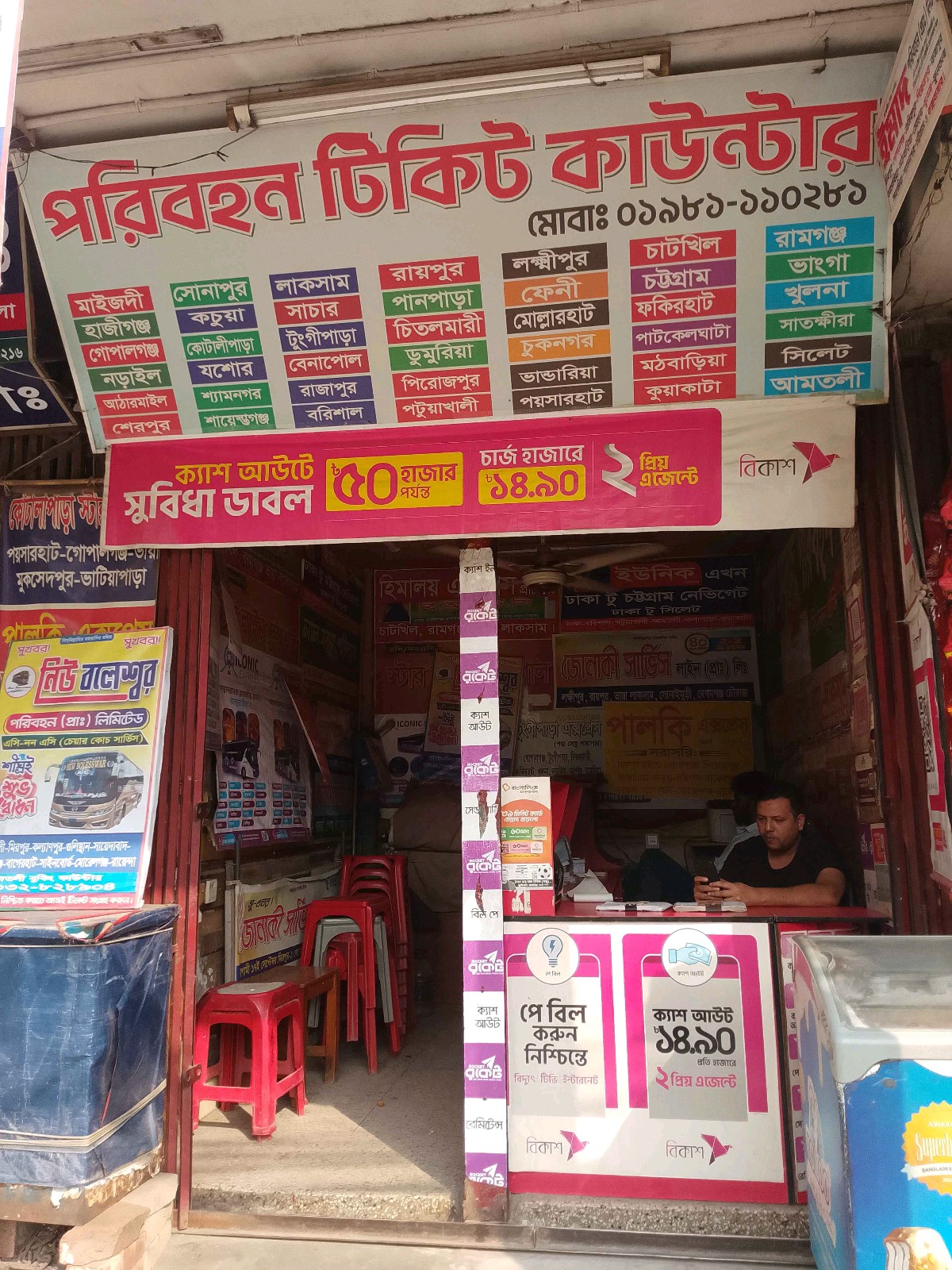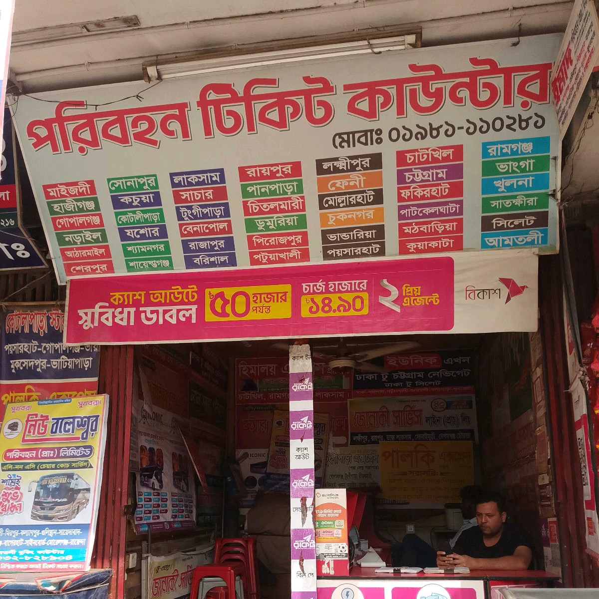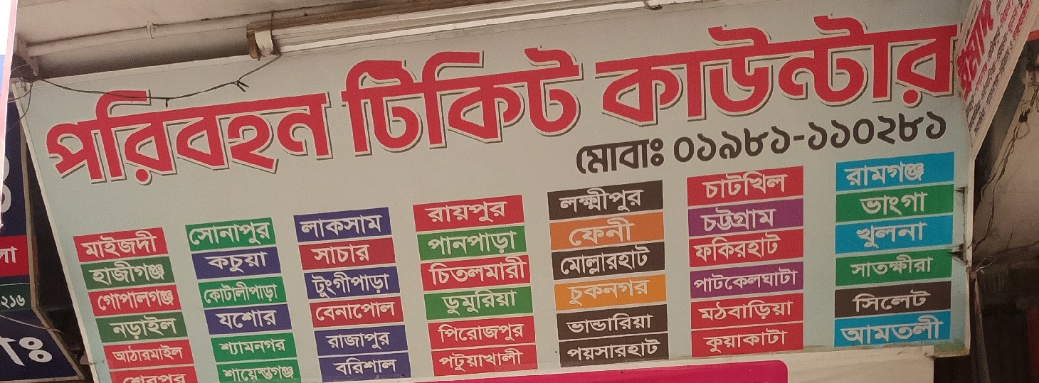 This bus ticket counter in Mirpur 1, Dhaka, provides convenient booking services for a wide network of transport routes across Bangladesh. Passengers can purchase tickets for destinations including Maizdi, Hajiganj, Gopalganj, Narail, Atarmail, Sherpur, Sonapur, Kotali Para, Jashore, Shyamnagar, Laksam, Benapol, Rajapur, Barishal, Raypur, Pirojpur, Patuakhali, Lakshmipur, Feni, Chattogram, Khulna, Satkhira, Sylhet, and many more. The service covers express and standard coaches, including air-conditioned options for comfortable travel. Serving both long-distance travelers and daily commuters, the ticket counter ensures easy bookings, reliable schedules, and safe journeys throughout the region.