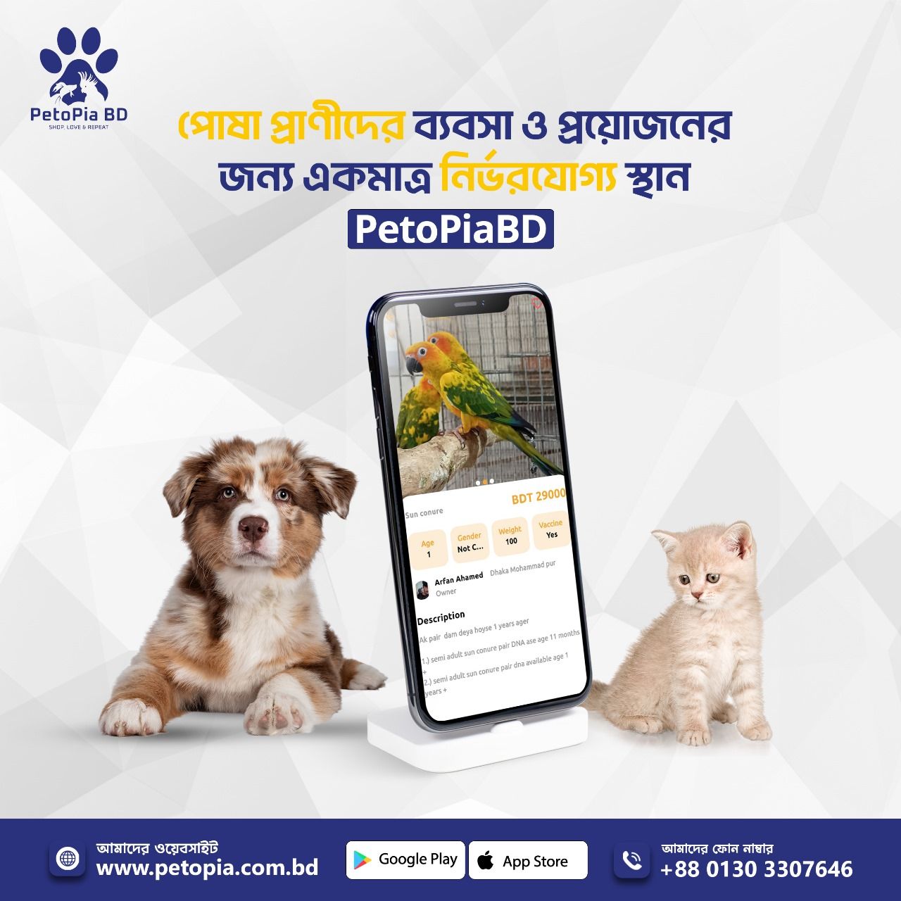 PetoPia BD, located in Mirpur, Dhaka, is a premier pet shop offering a comprehensive range of high-quality products and services for your beloved pets. Their extensive inventory includes premium cat and dog food, toys, grooming supplies, and health care products. PetoPia BD is committed to providing exceptional customer service, ensuring that your pets receive the best care possible. Whether you're a new pet owner or an experienced enthusiast, PetoPia BD is your trusted partner in pet care.