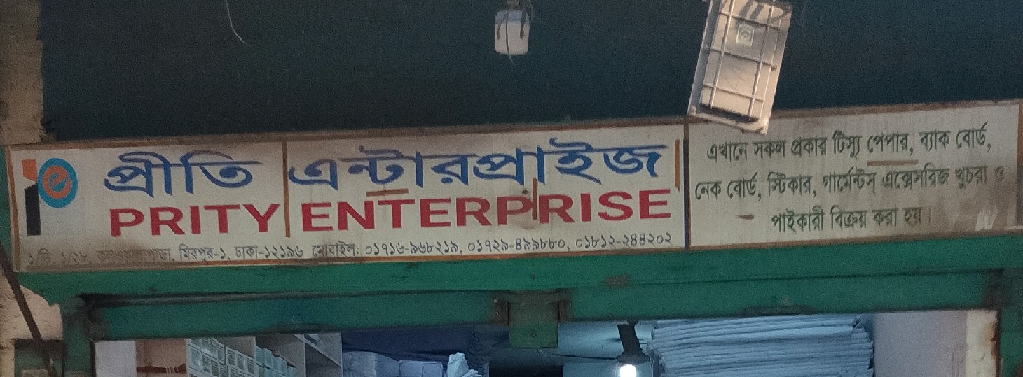 Prity Enterprise is a garments accessories and packaging materials supplier. The business provides a variety of essential products used in the garments and packaging industry. Customers can purchase tissue paper, back boards, neck boards, stickers, and other garments accessories required for clothing production, packing, and finishing. The shop serves both retail and wholesale buyers, including garment factories, small businesses, and traders who need reliable accessories for daily operations. Prity Enterprise focuses on supplying practical materials at competitive prices while maintaining dependable service for clients in the Mirpur area and surrounding markets.