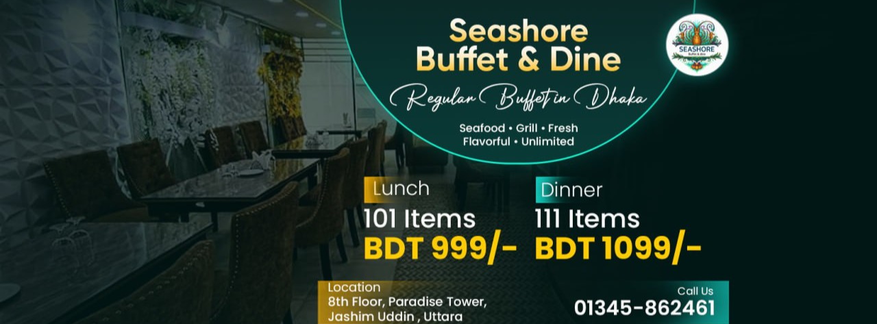 Seashore Buffet & Dine is a popular buffet restaurant in Uttara, Dhaka, offering a premium dining experience with a special focus on fresh seafood and international flavors. Located in Paradise Tower, this restaurant is known for its elegant setting, welcoming ambience and wide range of dishes that satisfy every type of food lover.