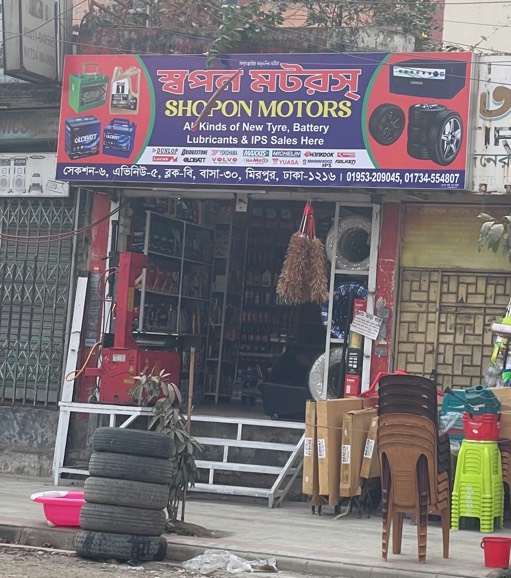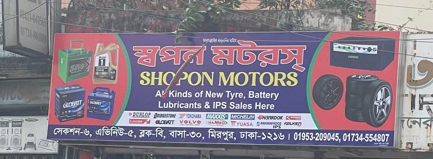 Shopon Motors is a trusted tyre, battery, and lubricants store in Mirpur, serving private car owners, motorbike riders, and commercial vehicles with reliable automotive solutions. Conveniently located in Mirpur, Shopon Motors is known for its quality products, competitive pricing, and professional customer service.