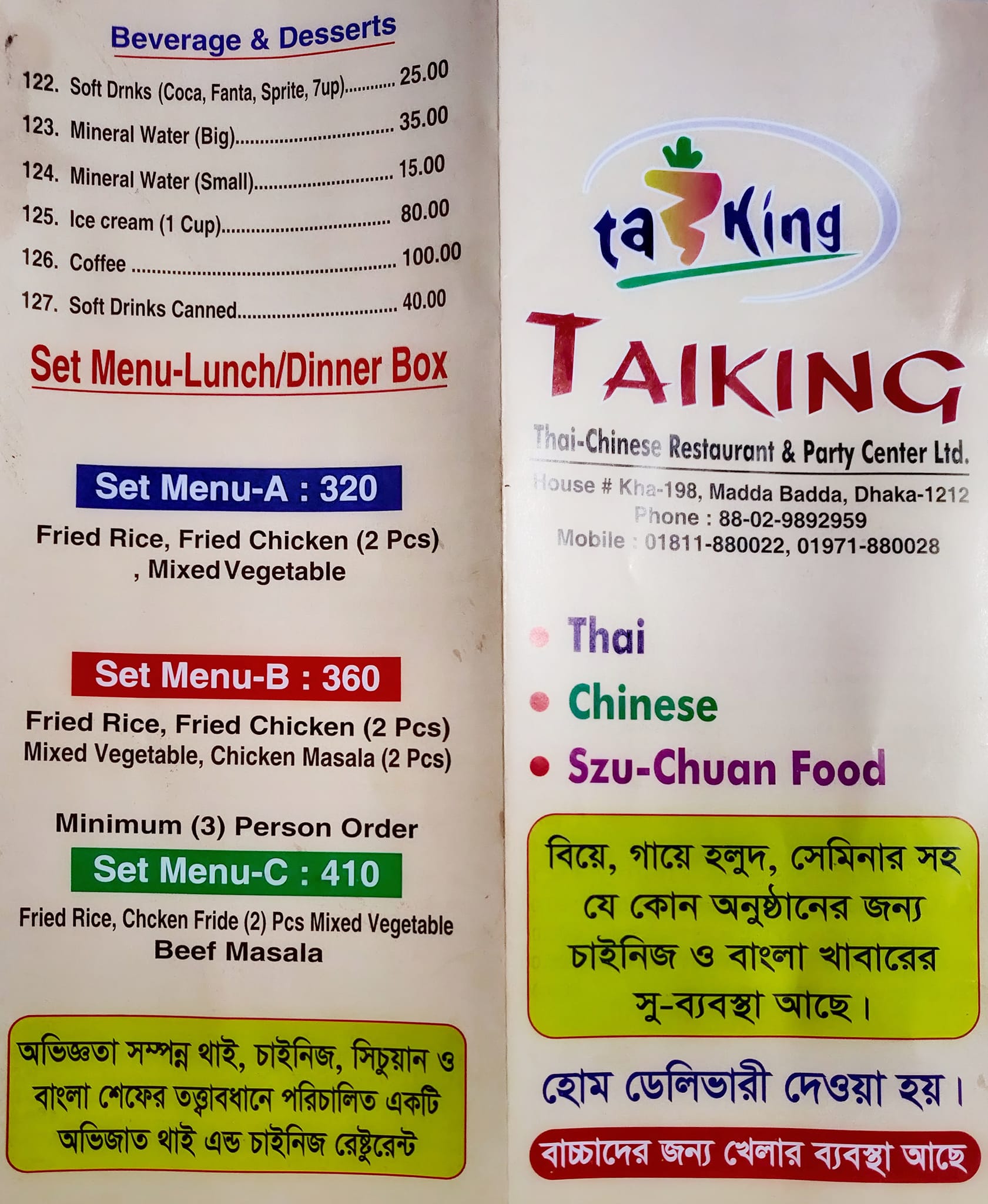 Welcome to TAIKING Restaurant. We are here to serve you delicious Thai Chinese & Indian food. We have Different Experienced chef for Thai, Chinese, and Indian food. We have a party center for big functions like marriage ceremonies, official conferences, meetings, birthday parties, and any social arrangement. we have a well-decorated separate Restaurant with a seating capacity of 50 people for a small party and family time pass. We are a premier catering service and restaurant offering a compelling fusion of Chinese and Thai cuisine. At Oriental Delights, we pride ourselves on delivering an unforgettable dining experience, filled with authentic flavors, aromatic spices, and the vibrant culinary traditions of China and Thailand. As a catering service, Taiking Thai-Chinese Restaurant & Party Center is dedicated to bringing the exotic and diverse flavors of the East to your special events and gatherings. Whether you're hosting a corporate luncheon, a family celebration, or a grand wedding, our team of skilled chefs and service professionals will ensure that every detail is meticulously taken care of. From the initial menu planning to the final presentation, we strive to create an enchanting culinary journey that will leave your guests mesmerized and satisfied.