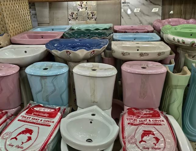 Wide selection of bathroom accessories, basins, tiles, and commodes