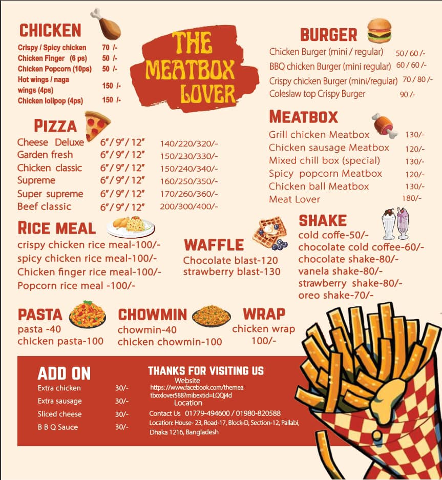 Discover MeatBox, the premier fast-food destination in Mirpur DOHS, Dhaka, renowned for its delectable meat-based dishes and exceptional service. Conveniently located at Sony Square, Plot/1, Road/2, Block/D, Section/2, Mirpur 1216, MeatBox offers a diverse menu that caters to all taste buds. From their signature Meat Boxes, loaded with grilled chicken cubes, chicken sausages, and crispy fries, to mouthwatering appetizers like Naga Chicken Wings and Chicken Popcorn, there's something for everyone. Complement your meal with refreshing beverages, including cold coffee and a variety of milkshakes.