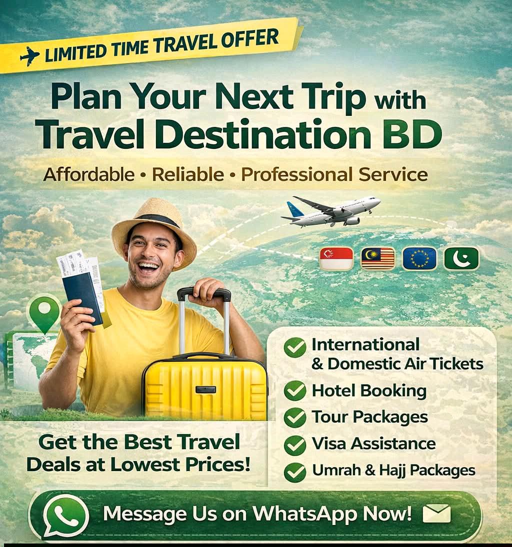Travel Destination BD is a trusted travel service provider offering professional tour planning and support for both local and international trips. The company focuses on creating seamless and enjoyable travel experiences, catering to clients who value convenience, comfort, and reliability. With expert guidance and personalised travel solutions, Travel Destination BD ensures every journey is well-organised and memorable. From holiday arrangements to customised tour packages, their services are designed to make travel planning effortless, allowing customers to explore destinations confidently and enjoyably.
