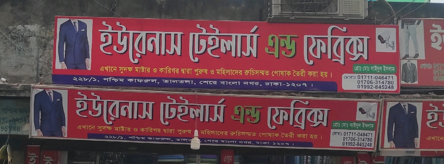 Urenas Tailors and Fabrics, located at 228/1, West Kafrul, Taltola, Dhaka, specialises in creating stylish and personalised clothing for men and women. The shop employs skilled masters and artisans who craft garments with attention to detail, ensuring a perfect fit and elegant finish. Customers can choose from a variety of fabrics and designs suitable for casual wear, formal occasions, and traditional attire. Urenas Tailors focuses on combining quality materials, expert stitching, and contemporary fashion trends to deliver customised outfits that reflect individual taste. The boutique is recognised for reliable service, precise tailoring, and stylish, comfortable clothing solutions.